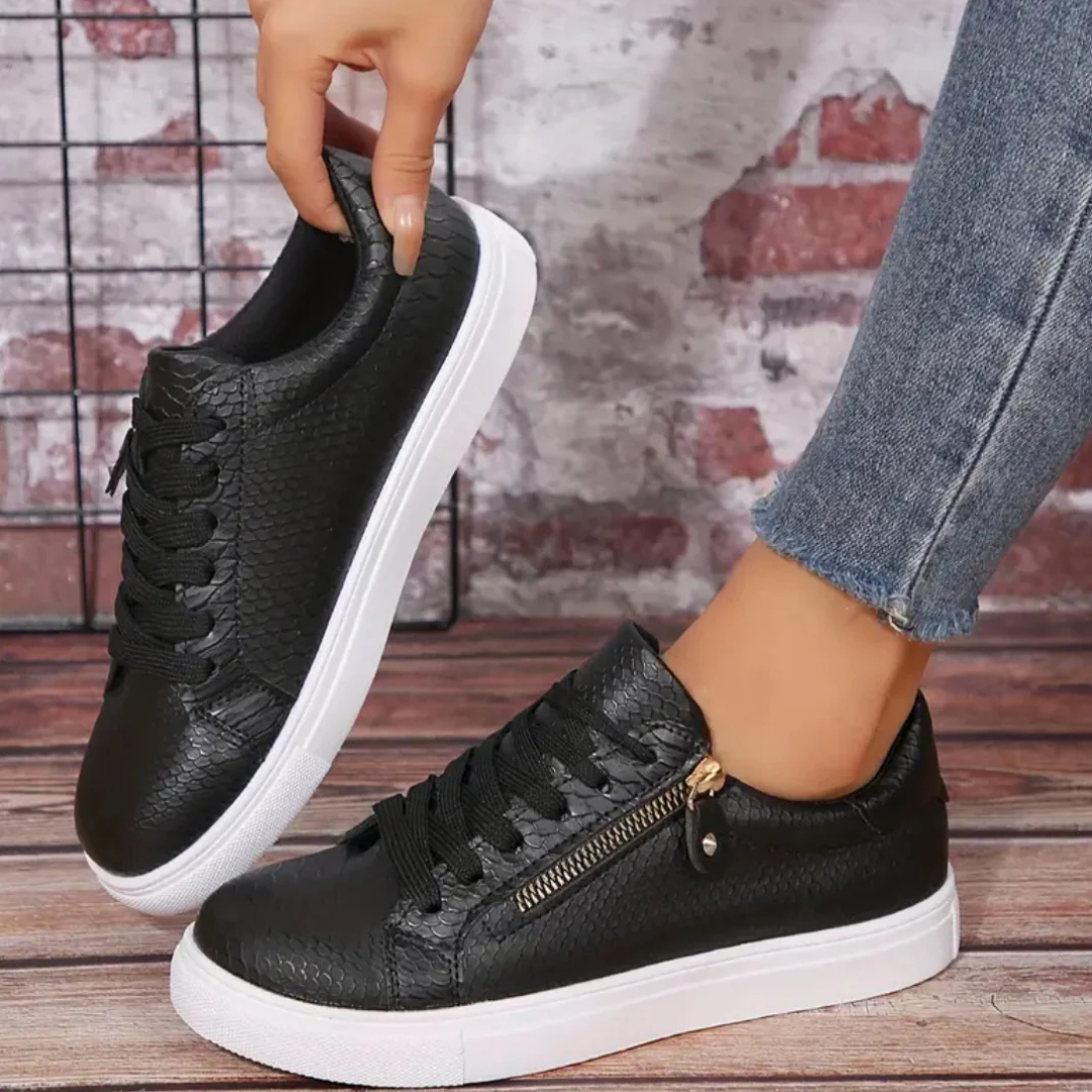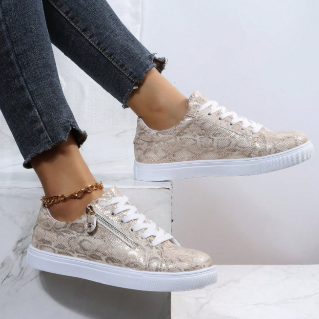 Le motif subtil effet peau de serpent apporte une note élégante et tendance. La fermeture combine lacets et petit zip doré sur le côté, pour enfiler les chaussures rapidement tout en conservant un ajustement parfait. Le bout rond et la semelle épaisse garantissent un confort optimal, même lors de longues marches ou de journées bien remplies.