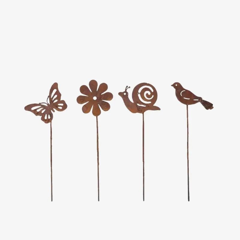 Ces piquets en métal au fini rouillé affichent des motifs découpés avec soin, inspirés de la nature. Leur style épuré et vintage s’intègre parfaitement à un décor campagnard, bohème ou industriel, apportant une touche d’originalité et de raffinement.
